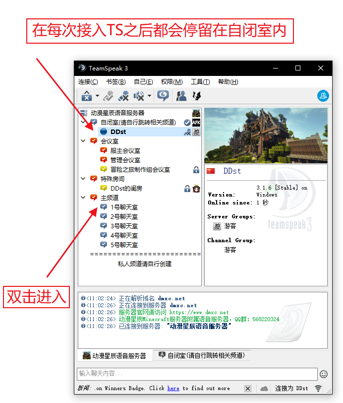 5. 鼠标点击 “连接” 按钮,在稍等片刻后即可成功接入DMXC的TS3语音服务器